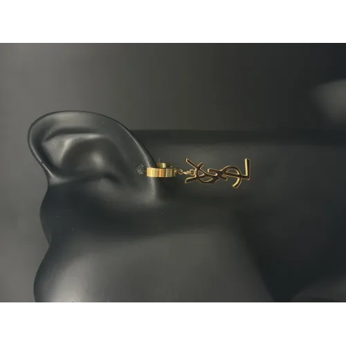 A bold tribute to Parisian luxury. The iconic YSL monogram dangles from a polished gold-tone huggie hoop for a look that is both edgy and classic.